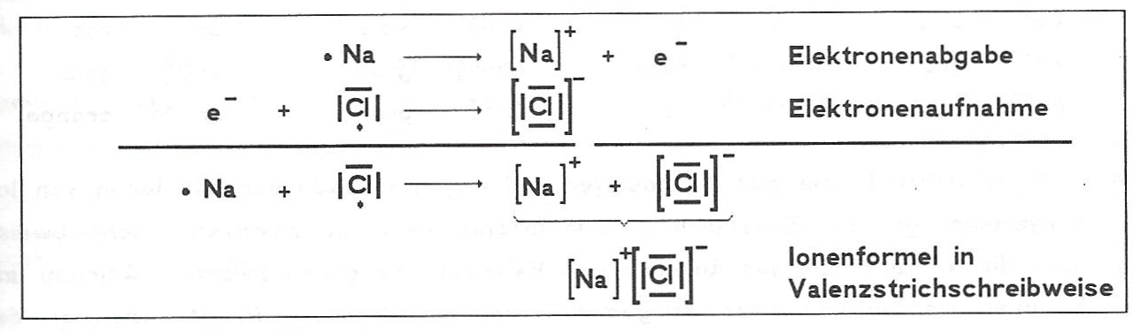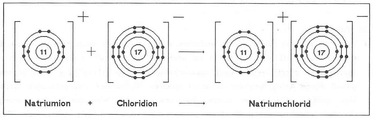 Stoffe mit Ionenbindung bestehen im festen Zustand aus Ionen bzw. aus Ionengitter. Die Ionen sind regelmäßige angeordnet. So ist im Natriumchloridkristall 1 Natriumion(•) von 6 Chloridionen(o) umgeben. Und 1 Chloridion ist von 6 Natriumionen umgeben. – Siehe Abbildung.