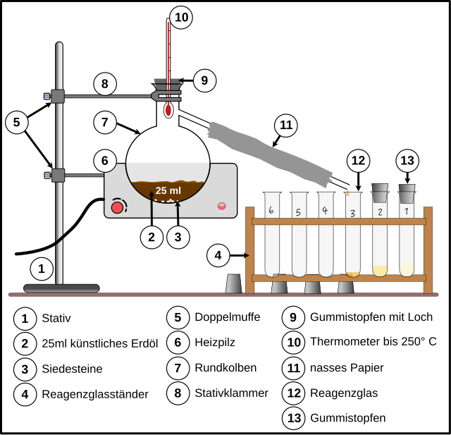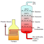 Bei der Erdöldestillation in Raffinerien gewinnt man aus Erdöl die verschiedenen Produkte wie Gase, Benzine, Diesel, Kerosin, diverse Schmieröle usw. aufgrund ihrer verschiedenen Siedepunkte.